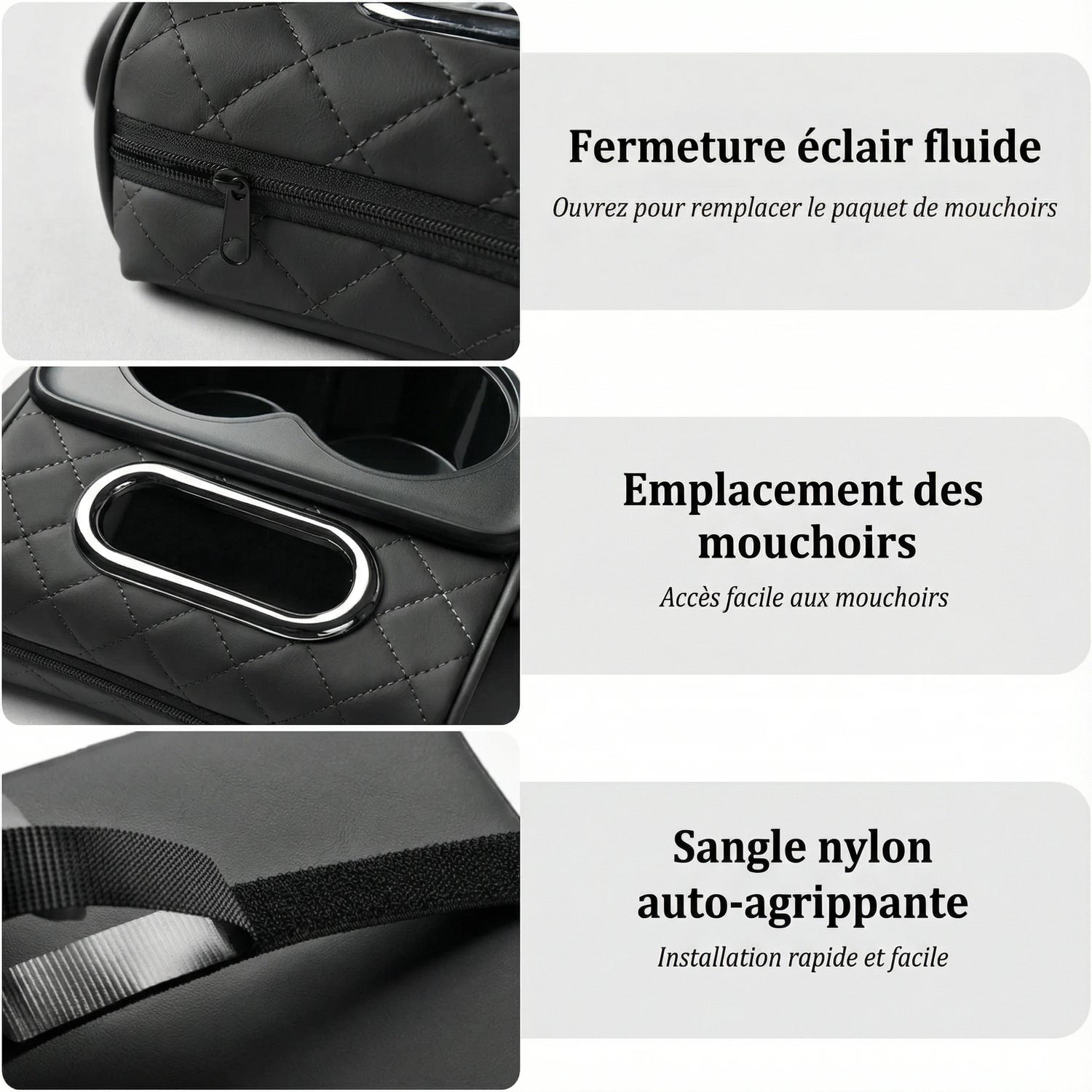 Deux porte-gobelets et un emplacement pour mouchoirs offrent un accès facile d’une seule main, sans distraction.