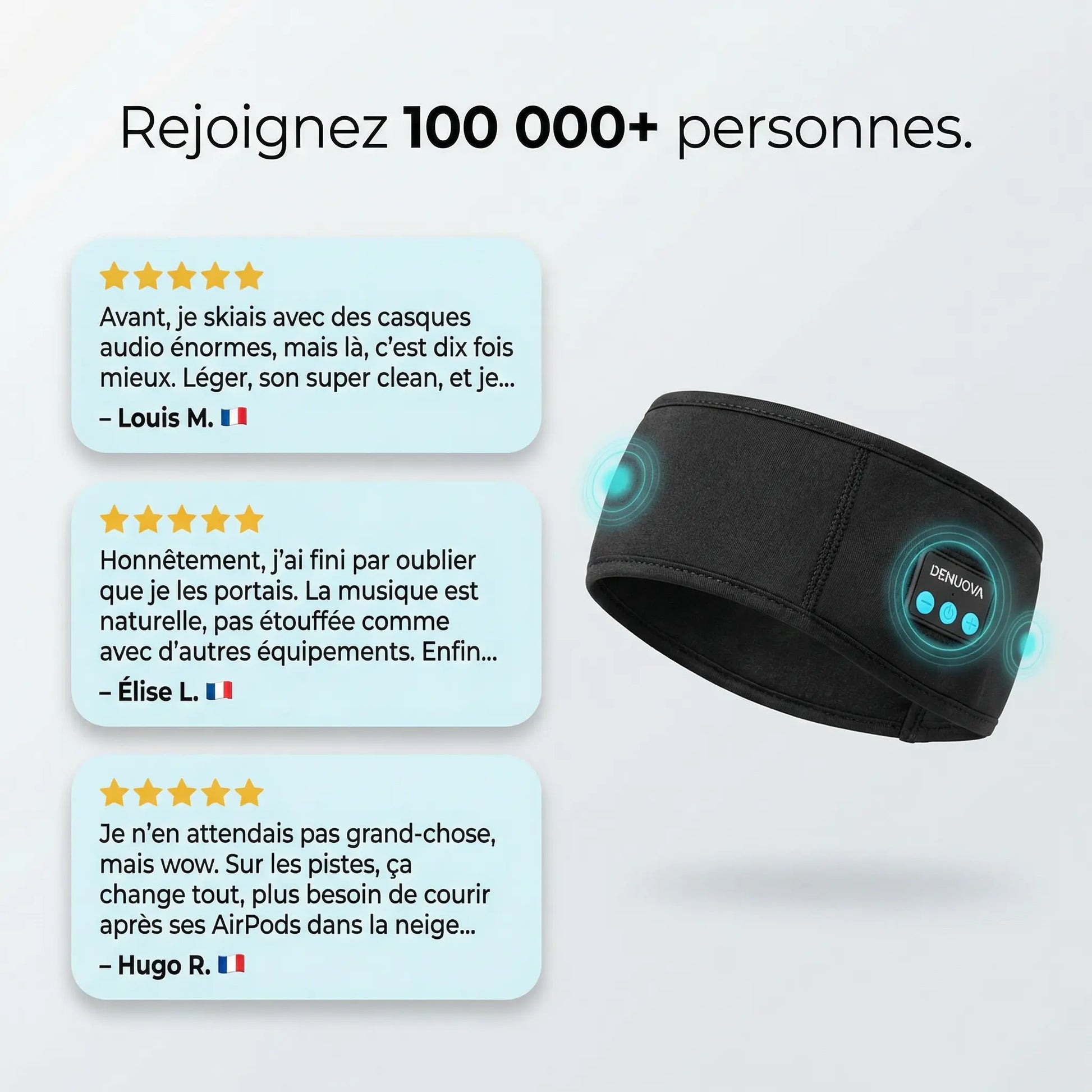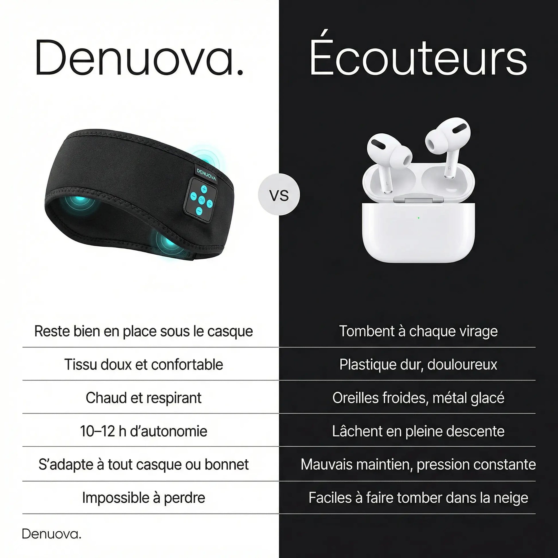 Pas de glissement, pas de pression — juste un confort quotidien qui suit vos mouvements. Conçu pour rester bien en place sous n'importe quel casque, le Denuova Bandeau Audio 2.0 vous garde au chaud, connecté et en rythme, de la première remontée jusqu'à la dernière descente.