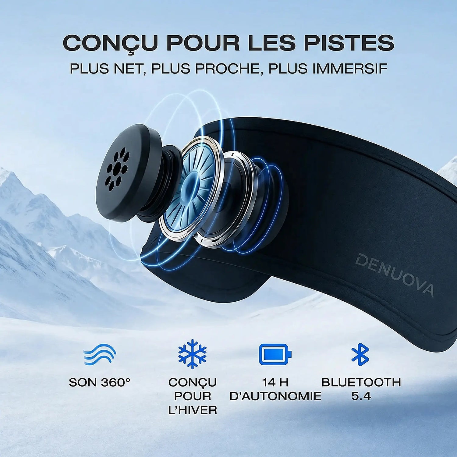 Le bandeau audio Denuova offre jusqu’à 14 heures d’écoute en continu après seulement 1 heure de charge — de quoi tenir une journée complète sur les pistes, ou une nuit entière.