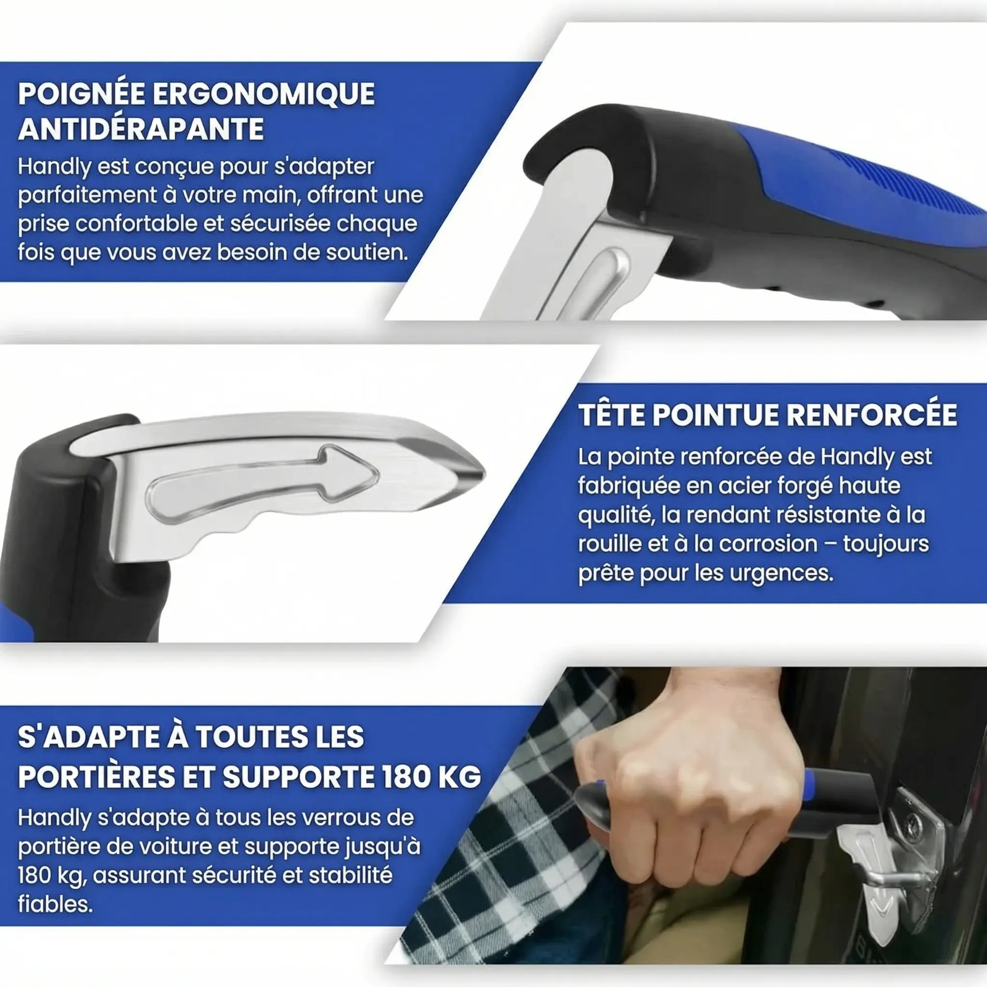 Poignée antidérapante confortable et compatible avec toutes les voitures : montez et descendez en toute confiance, sans hésitation.