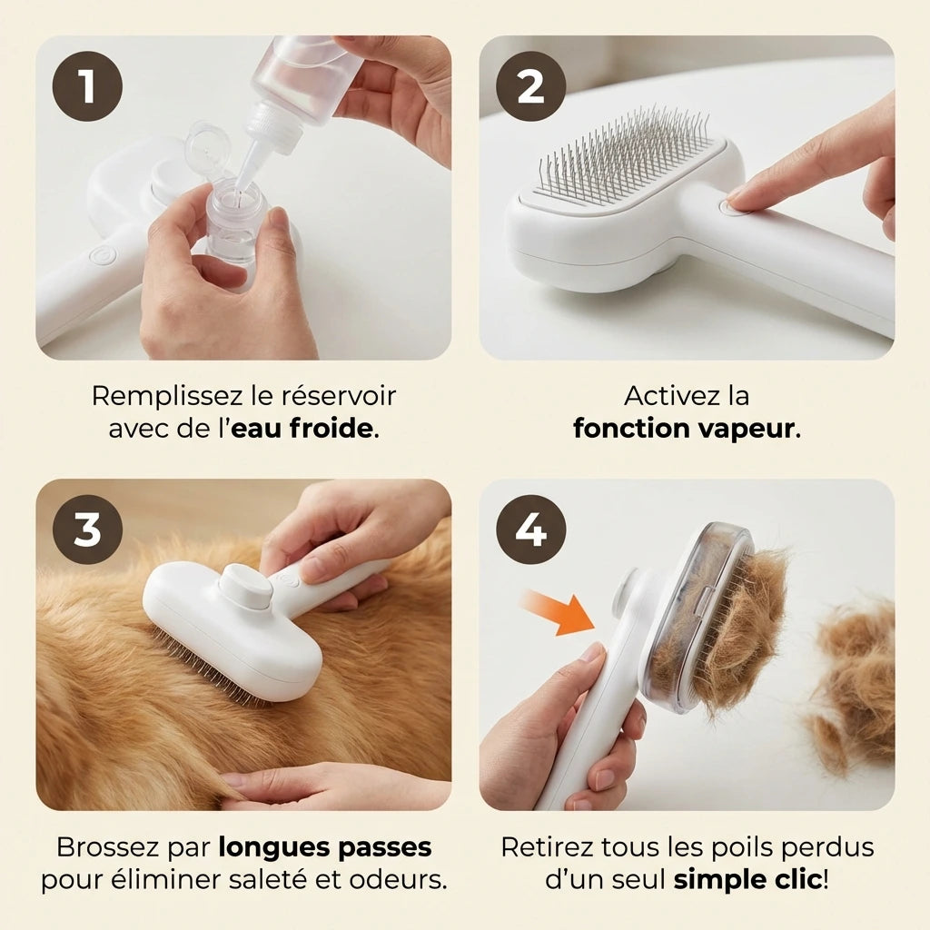 Oui ! La Steami Pro a été testée sur différents types de pelage, y compris les pelages épais et doubles comme ceux des Huskies ou des Golden Retrievers. La brume aide la brosse à glisser en douceur dans le pelage.